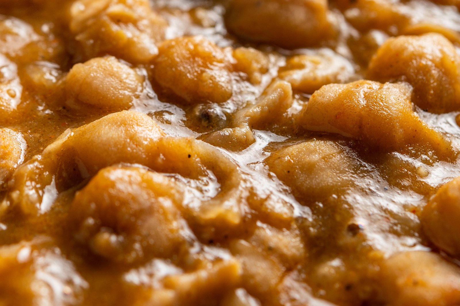 Garbanzos, yuba(soja), setas shiitake, cebollas, aceite de oliva virgen extra, ajos, especias (cominos, pimienta negra, clavos, pimentón), alga kombu y sal marina sin refinar.