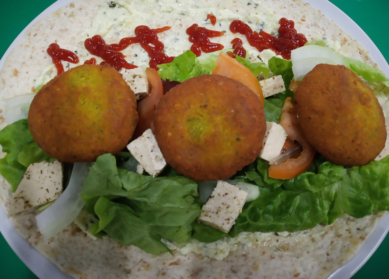 Durum de espelta (gluten), falafel artesano, lechuga. tomate, cebolla, feta vegetal, salsa de yogur de soja, ketchup.