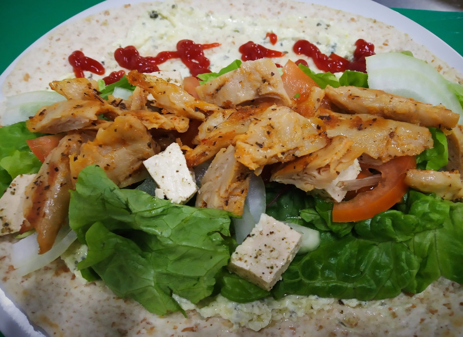 Durum de espelta(gluten), “heura”(soja), lechuga. tomate, cebolla, feta vegetal, salsa de yogur de soja, ketchup.