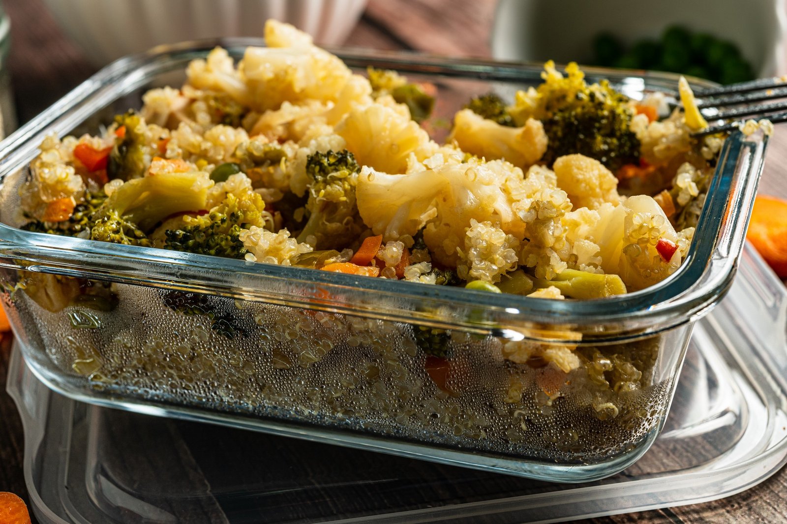 Quinoa, tofu (soja), brócoli, coliflor, zanahorias, pimiento rojo, pimiento verde, cebolla, guisantes, aceite de oliva virgen extra, salsa de soja, vino blanco (sulfitos) y sal marina sin refinar.